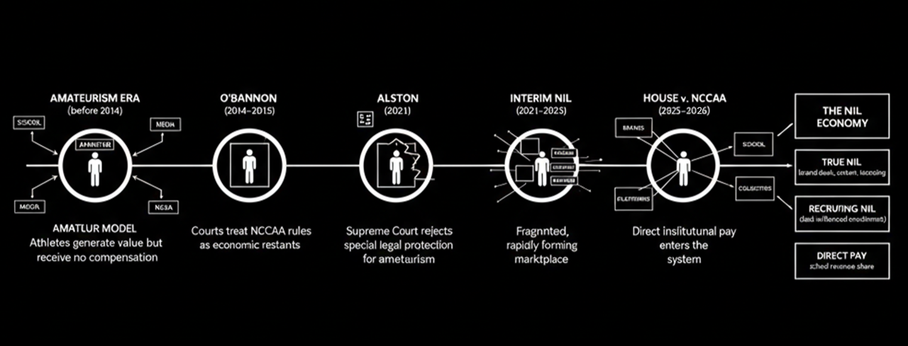 Amateurism to NIL Market, how legal decisions transformed College Sports into an open economic system.